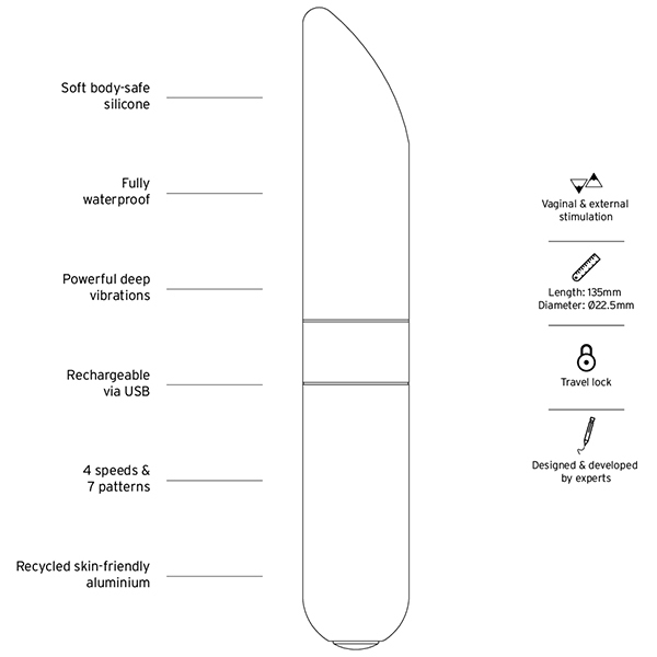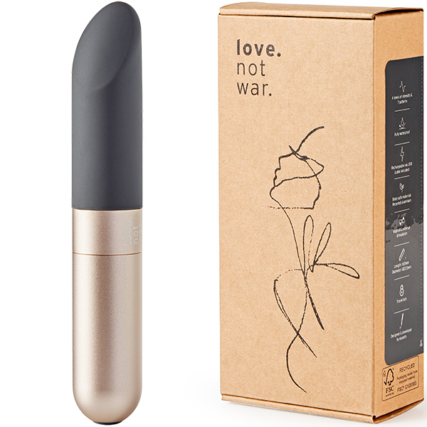 お肌に直接当たる先端部分は、ふんわりとソフトな心地よいシリコン。 表面がベタつかず、なめらかですべすべしています。 柔らかさを保ちつつもホコリは付きにくく、洗い流してお手入れすることが簡単です。 撫でるように繊細な振動から、お腹の中心に向かって響きわたるパワフルな振動、さらに、リズミカルな脈動まで、全10種類のバラエティに富んだ振動パターンを選べます。 ボタン一つでシンプルな操作。 小型のトイで静音、ポーチも付属のLove Not Warバレットシリーズは、携帯に向いているトーイです。 30分以内であれば1mまで浸水可能な完全防水仕様なので、万が一浴槽に落としてしまっても安心。 バスルームでも楽しめて、使える幅も広がます。 ●素材:シリコン、リサイクルアルミニウム、リサイクルABS樹脂、バイオプラスチック●充電方法:USB●充電時間:フル充電2時間●連続使用可能時間:最大1時間●振動パターン:10(振動強弱4段階+リズムパターン6種)●防水:完全防水(IP67)●トラベルロック機能つき ※こちらの商品は受注発注商品の為、ご注文から発送までに3、4営業日掛かる場合が御座います。 ![]() --![]() --