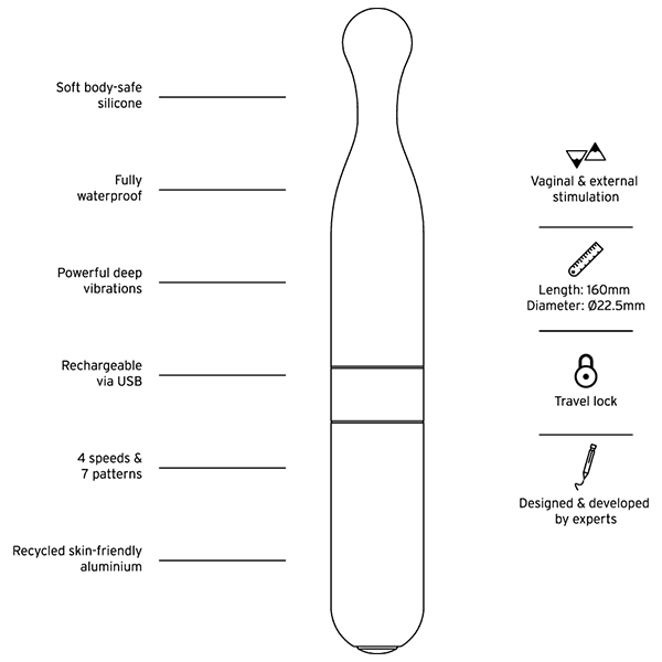 お肌に直接当たる先端部分は、ふんわりとソフトな心地よいシリコン。 表面がベタつかず、なめらかですべすべしています。 柔らかさを保ちつつもホコリは付きにくく、洗い流してお手入れすることが簡単です。 撫でるように繊細な振動から、お腹の中心に向かって響きわたるパワフルな振動、さらに、リズミカルな脈動まで、全10種類のバラエティに富んだ振動パターンを選べます。 ボタン一つでシンプルな操作。 便利なのはトラベルロック機能。 カバンの中で電源がオンになってしまう…まさかの事態を防げます。 30分以内であれば1mまで浸水可能な完全防水仕様なので、万が一浴槽に落としてしまっても安心。 バスルームでも楽しめて、使える幅も広がます。 ●素材:シリコン、リサイクルアルミニウム、リサイクルABS樹脂、バイオプラスチック●充電方法:USB●充電時間:フル充電2時間●連続使用可能時間:最大1時間●振動パターン:10(振動強弱4段階+リズムパターン6種)●防水:完全防水(IP67)●トラベルロック機能つき ※こちらの商品は受注発注商品の為、ご注文から発送までに3、4営業日掛かる場合が御座います。 ![]() --![]() --