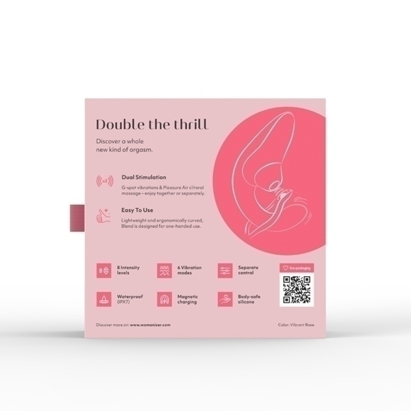 完全防水なのでバスルームでも使用可能。 使用後は丸洗いでき、衛生的に使用できます。 独立した2つのモーターにより、吸引と振動を同時に、または別々で楽しむことができます。 吸引と振動、ダブルの刺激によるオーガズムを「ブレンドオーガズム」と言いますが、このウーマナイザーブレンドはまさにブレンドオーガズム初心者の方にぴったりなアイテムです!●カラー:ヴァイブラントローズ ※こちらの商品は受注発注商品の為、ご注文から発送までに3、4営業日掛かる場合が御座います。 ![]() ヴァイブラントローズ![]() ブレンド![]() パッケージ:16.2×16.2×6.9cm 本体:13.9×11.3×5.1cm 重量:185g USB充電式![]() [ BACK ]