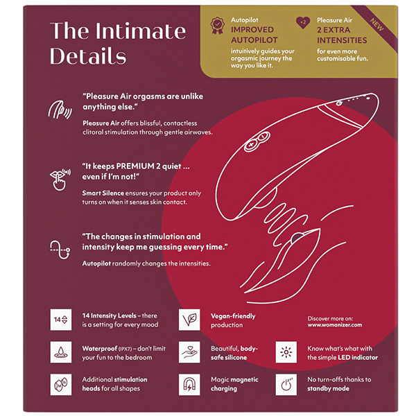 その名に恥じないプレミアムな機能を搭載♪ボタンを押さなくてもお肌に当てるだけで吸引が自動でスタートし、離すだけで振動が止まるタッチセンサー機能を搭載。 この機能はカップルさんで使うときにも本当に大活躍します♪さらにパイロットモードを搭載し、ボタン操作をしなくてもWomanizer自身が吸引の強弱を自動でコントロールしてくれます。 これにより予測できないゾクゾクとした楽しみが味わえます♪振動レベルは弱・中・強の3段階!ゆったりとラグジュアリーな時間を過ごすのに最適です♪素材はシリコン/ABS樹脂で2時間のフル充電により連続4時間での使用が可能です。 ※製造時期によりパッケージが異なる場合がございます。 ※こちらの商品は受注発注商品の為、ご注文から発送までに3、4営業日掛かる場合が御座います。 ![]() ボルドー![]() プレミアム2![]() パッケージ:18.0×19.5×7.0cm 本体:5.5×16.0×5.0cm USB充電式![]() [ BACK ]
