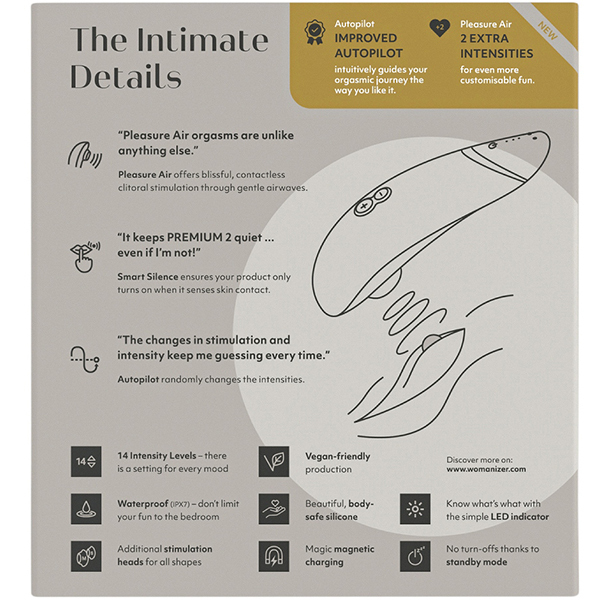 吸引強弱機能は12から14段階へパワーアップ!パイロットモードを搭載することで、ボタンの操作をしなくてもウーマナイザーが吸引の強弱を自動でコントロールしてくれます。 振動は弱・中・強の3段階!予測できない楽しみを味わいたいという人はもちろん、カップルさんで使うときにもこれらの機能は大活躍♪ボタン操作に慣れていない方でも感覚的にお楽しみ頂けます。 素材はシリコン/ABS樹脂で2時間のフル充電で連続4時間の使用が可能です。 ※製造時期によりパッケージが異なる場合がございます。 ※こちらの商品は受注発注商品の為、ご注文から発送までに3、4営業日掛かる場合が御座います。 ![]() グレー![]() プレミアム2![]() パッケージ:18.0×19.5×7.0cm 本体:5.5×16.0×5.0cm USB充電式![]() [ BACK ]