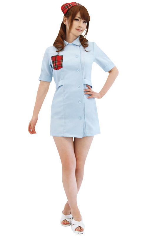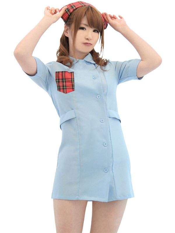 ![]() 涼しげな水色カラーのナースワンピースに、赤チェックの胸元ポケットを施し、同柄のナースキャップで乙女チックなイメージに!丸襟とボタン仕様がオシャレのアクセントになり、可愛さもグンっとUP!彼もときめくナース風コスチュームです。