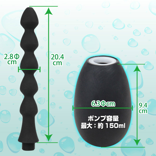 素材は肌触りのいいシリコンを採用!縦に並んだ大きさの等しい5連球が、内部に刺激を与えます。 また、本体の底部に付いたポンプには、ローションや洗浄のための液体を150ml入れることができ、使い勝手もバッチリ!中に入れた液体は先端のノズルから出てきます。 挿入から快感、そして洗浄までコレひとつで全部できちゃうアナル専用グッズです。 ※専用の取替ヘッド(b19707)(b19708)(b19709)(b19710)(b20854)も販売中です。 ![]() --![]() TYPE D![]() パッケージ:32.5×9.8×7.3cm 本体:ディルド20.4×2.8φcm・ポンプ9.4×6.3φcm(容量約150ml)![]() [ BACK ]