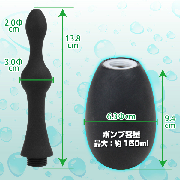 大きさの違う2つの膨らみがある先端部分は、クルッと回して取り外し可能。 空洞になっている中にローションを入れてピストンしてもよし、液体を入れて洗浄器として使用してもよし。 アナルプレイの全てが賄える、マットな質感の万能アナルグッズです。 ココローション30ml同梱。 ※専用の取替ヘッド(b19707)(b19708)(b19709)(b19710)(b20854)も販売中です。 ![]() --![]() TYPE E![]() パッケージ:25.1×9.7×7.3cm 本体:ディルド13.8×3.0φcm・ポンプ9.4×6.3φcm(容量約150ml)![]() [ BACK ]