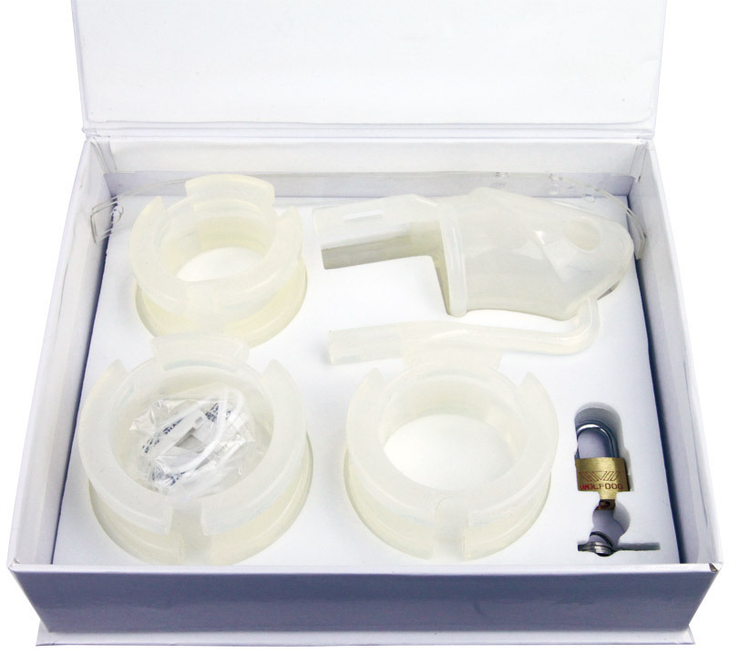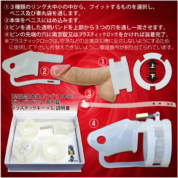 ![]() パッケージ:21.0×17.8×5.3cm 本体:全長11.0cm・ペニス挿入口内径3.4φcm・リング内径小4.2φcm、中4.7φcm、大5.2φcm セット内容:本体・リング3種(大中小)・ピン・バンド×2・南京錠・プラスチックキー×5・日本語説明書 ![]() [ BACK ]