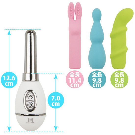 10種類の多彩な振動とボタンを押すだけの操作性がGOOD!手に馴染みやすい卵型グリップを採用した技ありローターです。 3つのキャップは、クリや乳首を挟んで刺激できるイボ付き耳のピンク、丸い先端と2つのくびれがほどよく括約筋を刺激するブルー、Gスポットに届きやすいカーブと螺旋のグリーン!もちろん、これらを被せなくても遊べます。 ![]() --![]() --