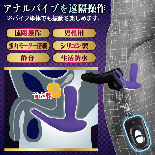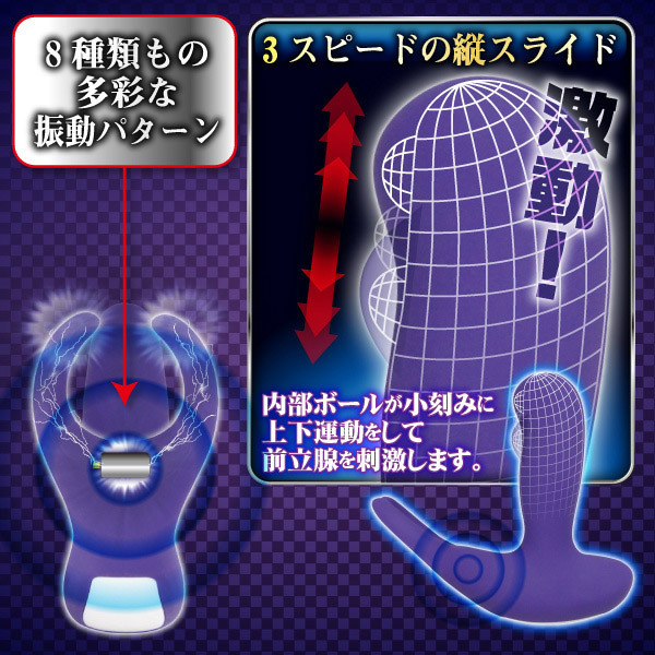 ●生活防水加工・パープルのソフトシリコンでコート●速度は3段階・前立腺に当たる内蔵ボールが小刻みにスライド●C字リングで後ろから玉袋の根元を完全ホールド●蟻の戸渡りへの振動は8種類・静音ハイパワーモーターを搭載。 リモコンはボタン電池式(CR2032)!本体は付属のUSBケーブルで充電します。 ![]() --![]() バックアタック![]() パッケージ16.4×16.4×8.2cm 本体:挿入部10.3×3.8×3.4cm USB充電式 リモコン:ボタン電池(CR2032)×1個使用![]() [ BACK ]