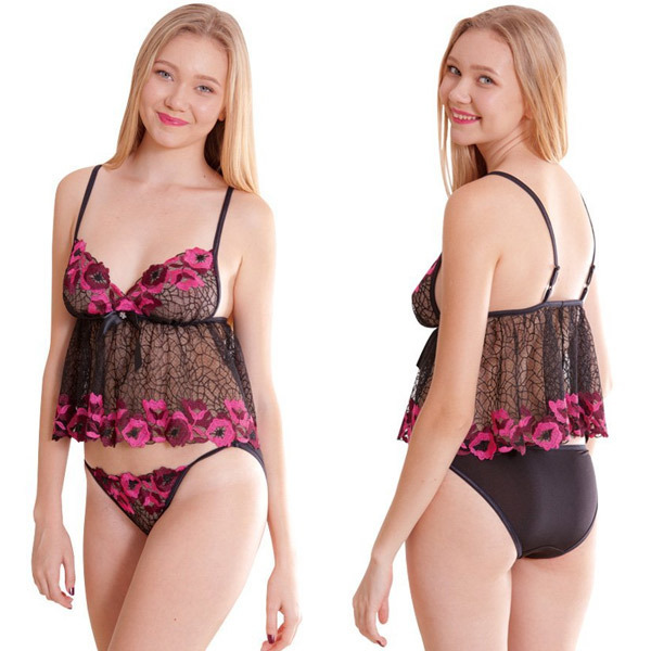 ![]() ブラックメッシュにローズカラーの花刺繍!お洒落で大人可愛いミニ丈ベビードール。