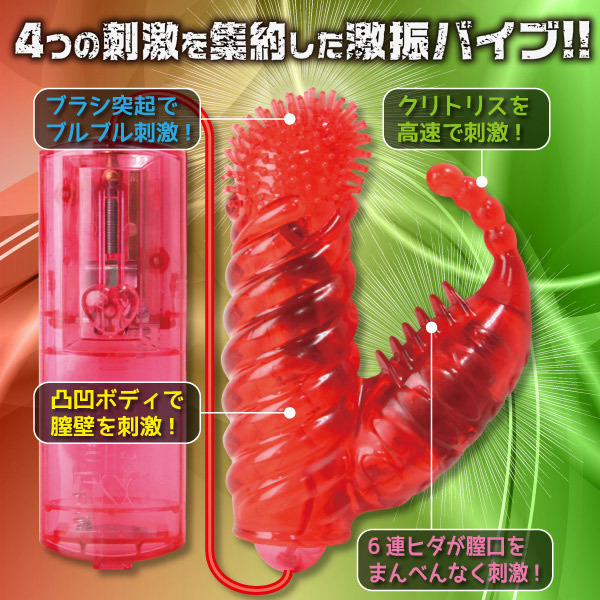 ●膣壁:凸凹トルネードの螺旋刺激●膣奥:本体先端ブラシのブルブル刺激●クリトリス:連結玉の高速刺激●膣口:クリバイブ側面ヒダの連続刺激●強弱調整はスライド式。 クリトリス、膣口、膣壁、膣奥へ同時に襲い掛かる激振動!4つの刺激が乱れ狂う刺激的なバイブレーターです。 ![]() --![]() --