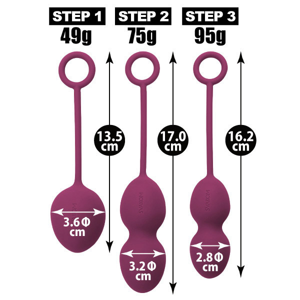 ●シックで妖艶なバイオレットカラー●形状&重さの異なるノバボール3種入●滑らかでマットな質感のシリコン製●それぞれ内部にメタルボールを内蔵●まずは49gからスタート→75g→95gと徐々にサイズ&レベルアップ●それぞれ1日30分程度を30日間継続●挿入したままスポーツなども可能●100%完全防水で丸洗いOK。 体の動きに合わせてランダムに動くメタルボールを感じよう!最終段階まで進めば、眠っていた骨盤底筋の目覚めを感じられるはず。 ソファなどに座りリラックスした状態か、立った状態で片足を上げると挿入しやすくなります。 ※こちらの商品は受注発注商品の為、ご注文から発送まで2〜3営業日掛かる場合が御座います。 ![]() バイオレット![]() Nova![]() パッケージ:14.5×12.0×6.0cm シングルボール:13.5×3.6cm(49g) ダブルボール1:17.0×3.2cm(75g) ダブルボール2:16.2×2.8cm(95g)![]() [ BACK ]
