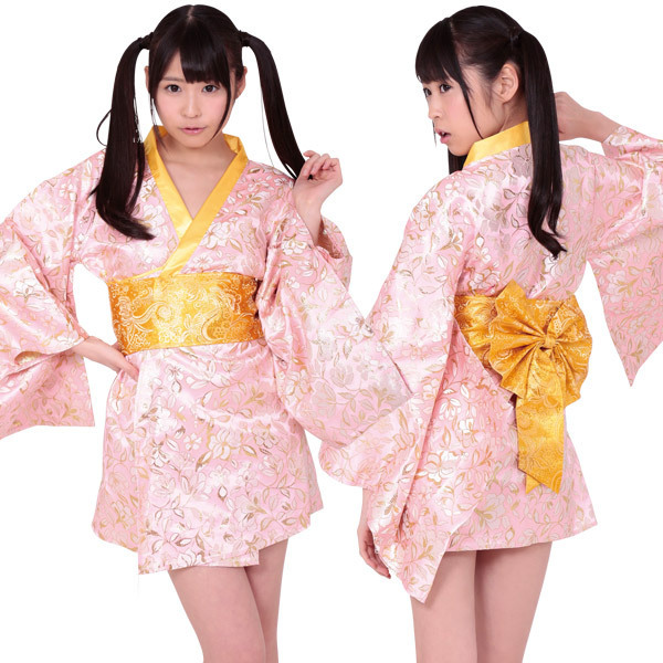 ![]() 艶やかなサテン生地で仕上げた淡いピンクのミニ着物ワンピース。