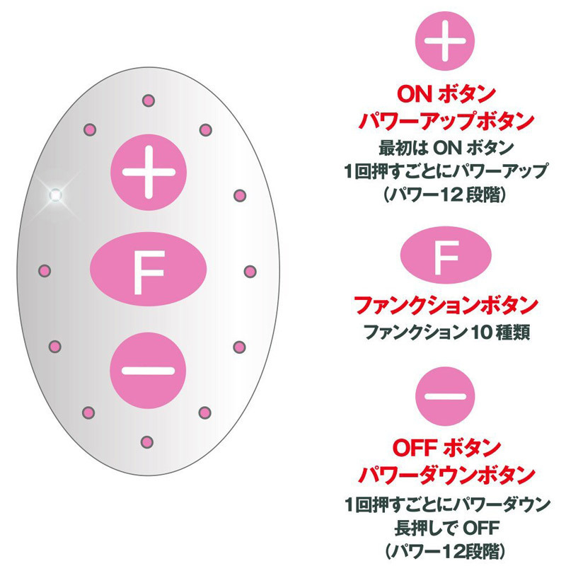 ●スタンダードなエッグ型タイプ●握りやすいスティックリモコン●12種強弱×10種リズム→120種振動●+…電源ON・パワーUP●-…電源OFF(長押し)・パワーDOWN●F…10種パターン切り替え●静音設計&生活防水仕様。 もう普通のローターには戻れないかも!小さな体に多彩なアクションをぎっしり詰め込んだピンクローター。 「BIG」という名前ですが大きさは定番のシングルサイズです。 ![]() ピンク![]() Type−R BIG![]() パッケージ:14.0×10.0×4.0cm 本体:ローター6.0×2.5cm リモコン8.6×2.8cm 電池:単四電池×2本使用![]() [ BACK ]