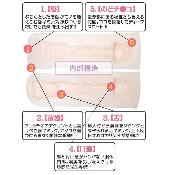 ●外観凹凸ナシのストレートボディ●リアルな女性の唇を模した挿入口●入口から覗く歯が絶妙アクセント●裏筋をニュルッと刺激する舌突起●ゾリゾリなぞる連続刺激の上あご●上下反転でまた違った快感に。 ジュポジュポとディープな挿入感を楽しめるフェラチオプレイを再現!喉奥めがけて突きまくればイラマチオ風なSプレイも可能。 唾液系ローションたっぷりでどうぞ。 ![]() --![]() --