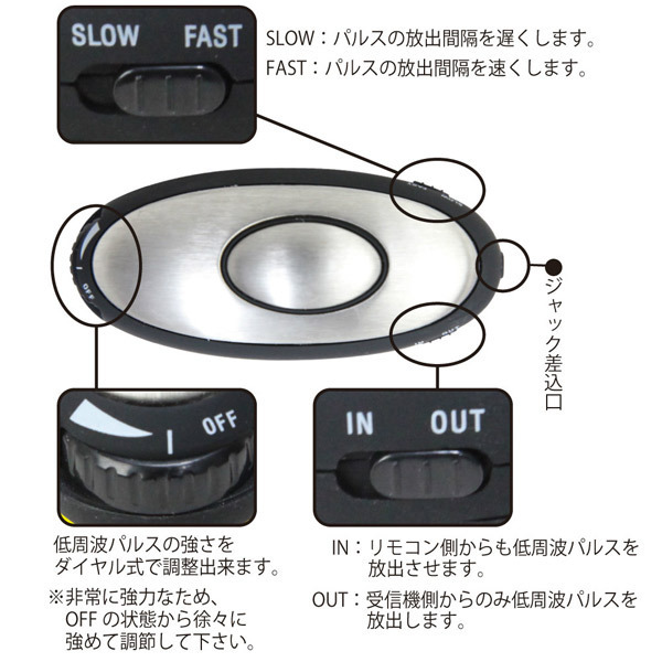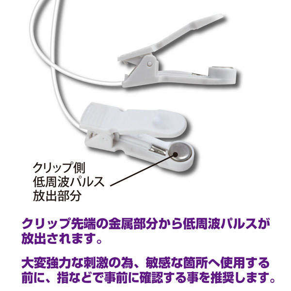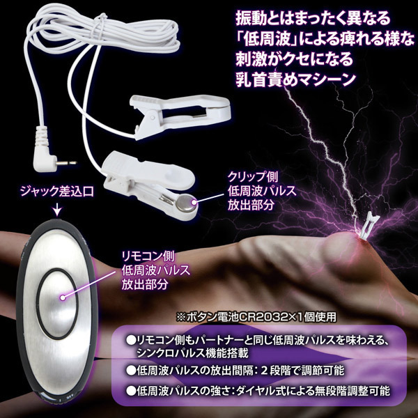 ●超刺激的な低周波パルスローター●乳首責め用の「サンダーパルス1」●ジャック式ニップルピンチ2個付●ダイヤル式で簡単にコントロール●低周波パルスの強弱は無段階調整●放出速度間隔は2段階の切り替え可●リモコン側にもパルス機能を搭載。 オナニーやSMプレイにも最適♪ビクンビクンと脈打つ低周波パルスの強烈刺激を味わえるエレクトログッズ「サンダーパルス1・ニップルピンチ」。 リモコン側にもパルスが発生するシンクロパルス機能を搭載し、パートナーと快感を共有することも可能!乳首をいじめ抜く癖になるような強い快感刺激は、チクニー上級者の方にもお勧めです。 ※非常に強力な刺激の為、ご使用の際はOFFの状態から徐々に強めて調節してください。 ![]() --![]() 1 ニップルピンチ![]() パッケージ:16.5×16.5×5.5cm 本体:クリップ部分開閉域〜2.0cm リモコン全長8.2cm 電池:ボタン電池(CR2032)×1個使用![]() [ BACK ]