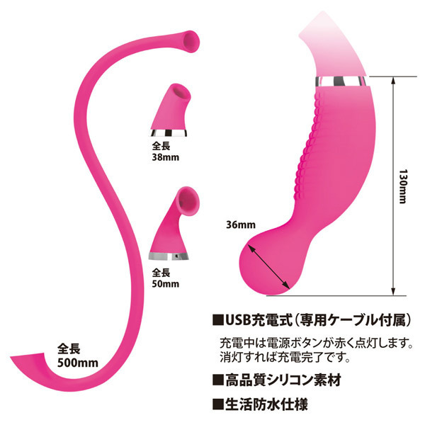 ●肌触りの良い高品質シリコン●12パターンの吸引&振動搭載●吸引アタッチメント3個付属●アタッチメント小:全長3.8cm●アタッチメント中:全長5cm●アタッチメント大:全長50cm●吸引口と逆側にモーター内蔵●ぷっくり丸い先端は挿入も可●生活防水仕様(水没は不可)。 まるで唇で吸われるような吸引力!あらゆるポイント責めができる吸引系ローター。 クリトリスから乳首まで用途別に使い分けて極上バキュームをご堪能ください。 ![]() --![]() バキュームサッキングマッサージャー![]() パッケージ:30.0×11.8×5.3cm 本体:挿入部13.0×3.6cm・アタッチメント小全長3.8cm・アタッチメント中全長5.0cm・アタッチメント大全長50.0cm セット内容:バイブ本体、吸引ホース×3種、充電ケーブル USB充電式 ![]() [ BACK ]