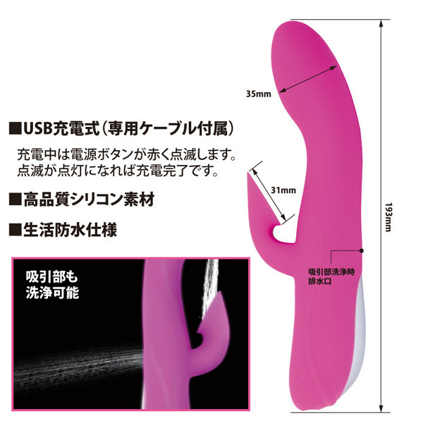 ●肌触り抜群の高品質シリコン●全長19.3cm、最大径は3.5cm●ヘッドに高性能モーター内蔵●角度をつけた先端でG直撃●クリバイブに吸引機能を搭載●唇に吸い付かれるような刺激●強力な12パターン吸引&振動●USB充電式(専用ケーブル付属)●本体は生活防水仕様で衛生的●クリ吸引部分の洗浄も可能。 クリ吸引グッズとGスポットバイブが合体!ありそうでなかった画期的なバイブレーター。 クリバイブ逆側に排水口が配置されているので、内部までしっかり洗浄できて衛生的です。 ![]() --![]() バキュームサッキングバイブレーター![]() パッケージ:27.1×12.2×5.3cm 本体:19.3×3.5cm クリ吸引部3.1cm セット内容:バイブ本体、充電ケーブル USB充電式 ![]() [ BACK ]