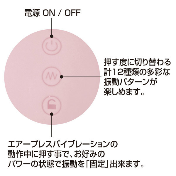 ●滑らかな肌触りのシリコン製●瓢箪型のコンパクトなボディ●全長11cm・振動部最大径3cm●乳首やクリトリス責めに最適●下部を握る圧力で強弱調整可●振動パワーのロック機能搭載●12パターン振動はボタン切替●USB充電式(専用ケーブル付属)●充電60分で約90分連続使用可。 バルーン状の本体両サイドを押した際の圧力によって、振動パワーを自由にコントロール出来る「エアープレスバイブレーション」機能を搭載!ダイレクトに振動を操ることで、より直感的に楽しめるバルーンローター。 「エアープレスバイブレーション」の動作中にお好みの振動パワーのまま固定できるロックボタンを配置!また、バルーンによる振動の強弱以外にも、ボタンプッシュで切り替わる12種の振動パターンも搭載しています。 ![]() --![]() エアプレッシャーローター![]() パッケージ:17.9×7.9cm 本体:11.0×3.0cm USB充電式![]() [ BACK ]