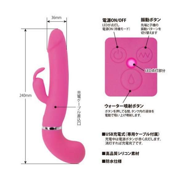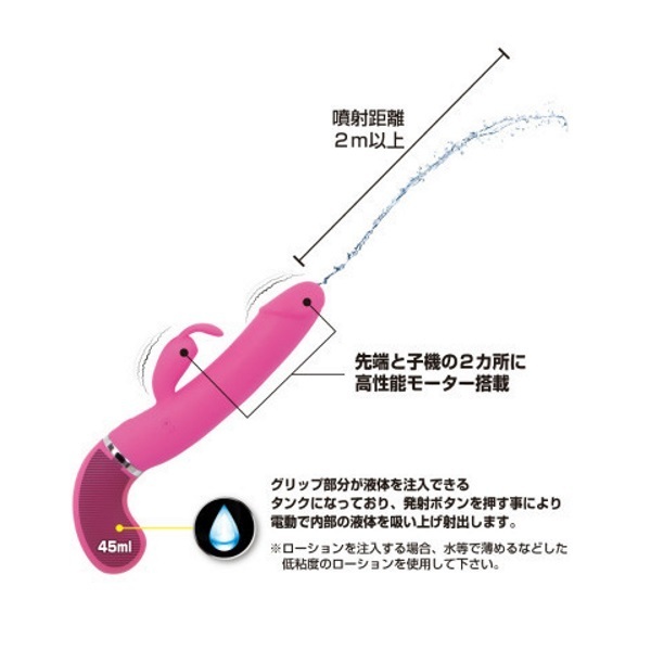 ●ピストルのようなシルエット●高品質なシリコン素材を採用●滑らかボディで挿入感も抜群●先端&子機に高性能モーター●12種類の多彩な振動パターン●ウォータースプレー機能搭載●液体45mlをタンクに注入可能●ボタンを押すと先端から噴射●液体の噴射距離は約2m以上●生活防水仕様で丸洗い可能●電源はUSB充電式。 先端からお好みの液体をドピュッと発射!中出し体験が出来るウォータースプレー機能を搭載した「プリティラブ」シリーズのバイブレーター。 雫マークの噴射ボタン押下中は、タンク内(グリップ部)にある液体を自動で吸い上げて噴射し続けます。 ※詰まり等の原因になりますのでローションをタンクに注入する場合は、水やぬるま湯で薄めた低粘度のローションをご使用ください。 ![]() --![]() ウォーターガンバイブレーター![]() パッケージ:27.0×11.8×5.2cm 本体:全長24.0cm 挿入部最大径3.6φcm USB充電式![]() [ BACK ]
