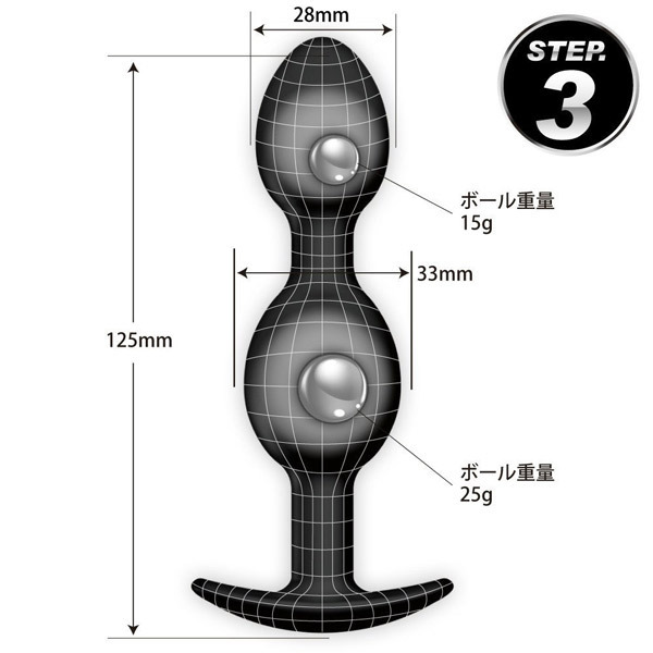 ●全長12.5cm×最大径3.3φcm●大小2連団子型の「STEP3」●ストッパー付きのプラグ形状●安心安全な高品質シリコン素材●メタルボール2個(小15g・大25g)を内蔵●自在に動いて存在感をアピール。 アナル開発や日常装着用に♪コンッコンッとノックするような刺激を楽しめるメタルボール入りアナルプラグ。 シリーズ最大ボディの「STEP3」は、異なる重量のメタルボール2つが各々動くランダム刺激を楽しめます。 ![]() --![]() スペシャルアナルプラグ STEP 3![]() パッケージ:14.0×8.0×4.0cm 本体:12.5×3.3cm![]() [ BACK ]