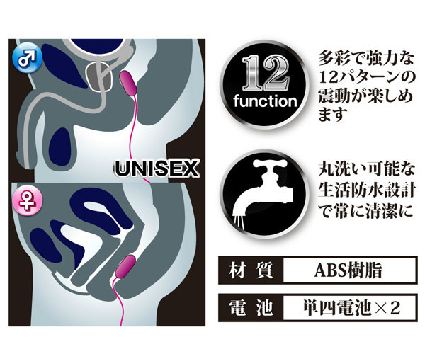 ●2.5×1.1cmのマイクロローター●12種の振動でリズミカルに刺激●ON/OFF・振動切替はワンタッチ●丸洗い可能な生活防水で清潔●単四電池×2本使用(別売り)。 直径わずか1cmほどの超小型サイズながら、強力振動を生み出すアナルローター。 初心者から上級者まで男女兼用で使えるマルチ&ユニセックスなアナルグッズです。 ![]() --![]() --