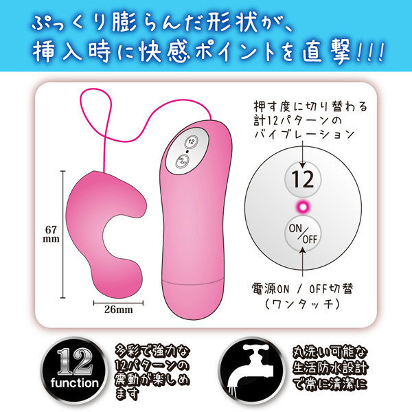 程よい柔らかさのシリコン製ボディが優しくフィット!人間工学に基づいたぷっくり膨らみフォルムが挿入時にGスポットを直撃します。 ボタンを押す度に切り替わる多彩で強力な計12パターンの振動機能を搭載!挿入だけでなくクリや乳首への押し当てによるピンポイント刺激も可能です。 中イキ派垂涎、至高フォルムのピンクローター!丸洗い出来る生活防水仕様でいつでも清潔に使えます。 ![]() --![]() --