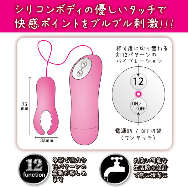 程よい柔らかさのシリコン製ボディ!優しいタッチのアーム2本でクリトリスや乳首を挟み込むようにブルブル刺激します。 ボタンを押す度に切り替わる多彩で強力な計12パターンの振動機能を搭載!さらに敏感ポイントだけでなく、アームで男性器を挟んでの刺激も可能です。 外イキ派垂涎、至高フォルムのピンクローター!丸洗い出来る生活防水仕様でいつでも清潔に使えます。 ![]() --![]() --