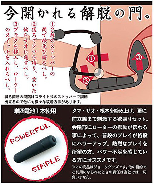 ●伸縮性のあるシリコンタイ●玉袋・竿・根元を締め付け●スライド式で簡単に調整可●最大径2.8φcmのプラグ付き●内蔵ローターが会陰部刺激●簡単操作のワンタッチ電源●ローターは着脱可能。 今開かれる解脱の門!3点を同時攻めしながら勃起力まで助太刀してくれる男性用補助グッズ。 2本のストッパーの間で根元を縛り、後ろ側で玉袋を縛って開いた輪をサオに通したら、アナルプラグを挿入してローターのスイッチをON!締め付けによる持久力UPだけでなく、男性の性感帯である「蟻の門渡り」を刺激することで射精感もUP!快感もパワー不足もアシストしてくれるマルチなアイテムです。 ![]() --![]() 僧![]() パッケージ:12.8×8.8×5.6cm シリコンタイ:フリーサイズ アナルプラグ:最大径2.8φcm 付属ローター:9.0×1.8φcm 電池:単四電池×1本使用![]() [ BACK ]