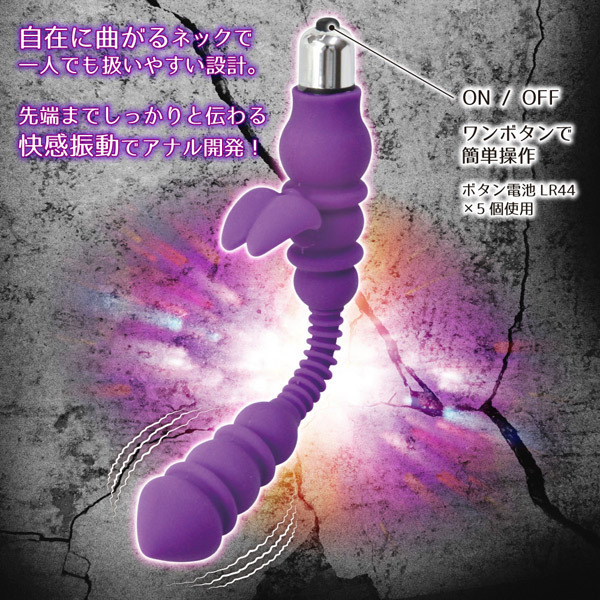 高品質シリコンを採用した凸凹のリング状ボディがアナルをほぐしながら奥まで届きます。 さらに、先端までしっかりと伝わる強力バイブレーションが前立腺を直撃!自在に曲がるフレキシブルネックと、ワンボタンの簡単操作で一人でも扱いやすい設計です。 ボタン電池LR44×5個付属。 ![]() --![]() --