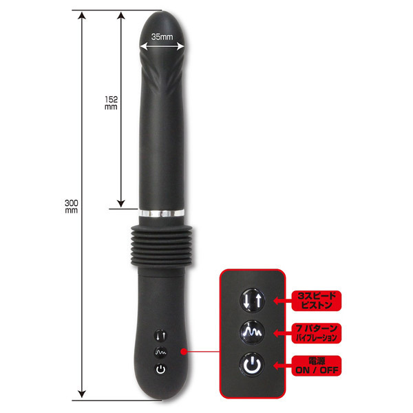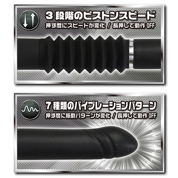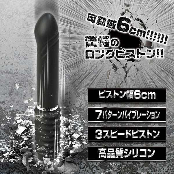 3段階のピストンスピードと7種類のバイブレーションを搭載!可動幅6cmの大迫力ピストンでポルチオに直撃しまくり、先端部分に搭載された強力モーターで快感振動が奥まで響き渡ります。 約120分のフル充電で60分の連続稼働が可能なUSB充電式(コード付属)です。 ![]() --![]() --
