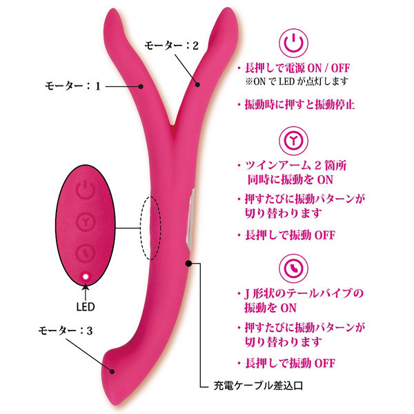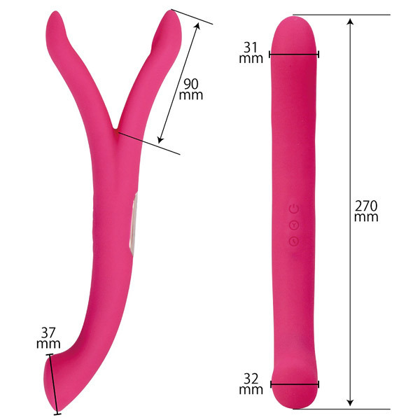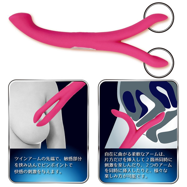 シリコン製のボディそれぞれの先端3ヶ所に、8パターン振動を備えた高性能モーターを搭載。 二股のアームで乳首やクリをピンポイントで挟み込み!また、J型に絶妙なカーブを描く逆側のテールバイブはGスポットを確実に捉え、芯まで響くアクメ必至の強力刺激をもたらします。 自在に曲がる柔軟なアームは片方だけを挿入して二ヶ所同時刺激や、二つのアームを同時に挿入したりとマルチに楽しめます。 USB充電式(専用コード付属)。 ![]() --![]() トライ![]() パッケージ:29.6×9.0×4.7cm 本体:27.0×3.7cm・ツインアーム9.0×3.1cm 重量:210g USB充電式![]() [ BACK ]