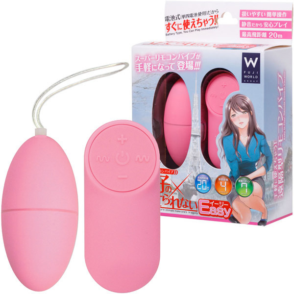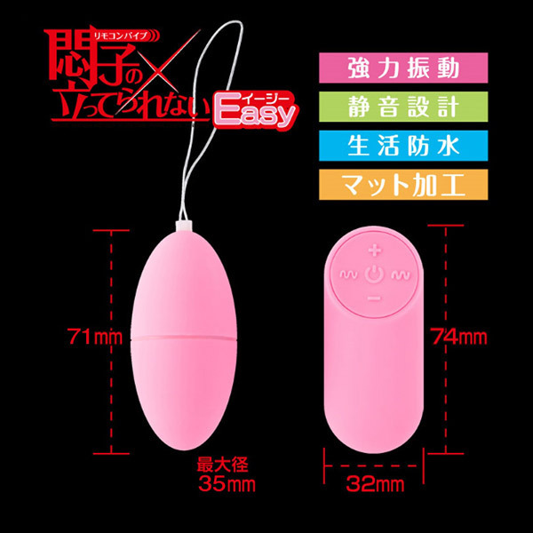 「悶子の立ってられないEasy(イージー)」が手軽な使用感・価格になって登場しました。 従来同様の受信性能を維持しながら、リモコンで4段階のパワー強弱と7パターンの豊富な振動、さらに最大20mの遠距離操作も可能なので、プレイをより楽しませてくれます。 単4電池が2本とボタン電池CR2032が1個付属されているので買ってすぐに使うことができるのも魅力です。 ※【ご利用前の注意点】本体をひねり電池ボックスを開け絶縁紙を取り外してから使用してください、絶縁紙を付けたままだと動きません。 ![]() --![]() イージー![]() パッケージ:16.5×11.5×5.0cm 本体:7.1×3.5cm・リモコン7.4×3.2cm 重量:52g 電池:本体単四電池×2本使用、リモコンボタン電池(CR2032)×1個使用![]() [ BACK ]