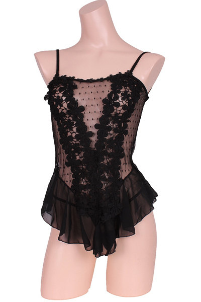 ![]() フロントに花柄モチーフをVラインにあしらい、裾のシフォンフリルでウエストのくびれを強調!ベースは模様入りストレッチネットだからフィット感抜群のベビードールとTバックの豪華セット。
