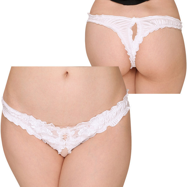 ![]() フロントにフラワーレースをあしらったエレガントなデザインショーツで、光沢感が華やかに魅せてくれています♪ホワイトカラーで清純そうに感じられますが、実は結構大胆な作りとなっていて、よく見てみるとクロッチ部分がオープンになっているというエロティック仕様。