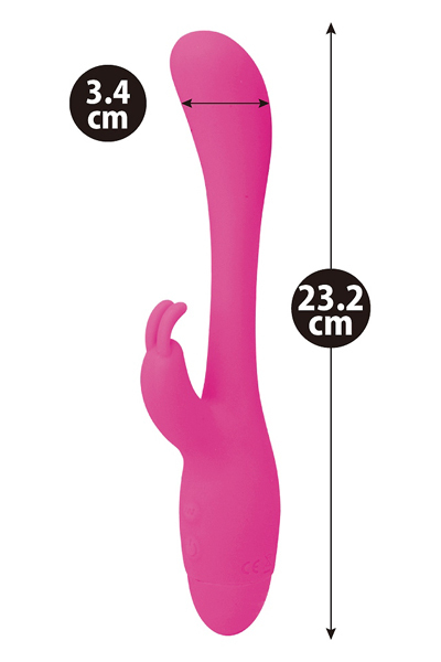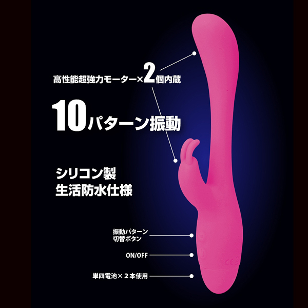 先端部分とクリバイブに内蔵されている強力モーターが生み出すバイブレーションは圧巻!滑らかな肌触りのシリコン製ボディは挿入しやすく、先端はぷっくりと膨らんでいてGスポットを狙いやすく、クリバイブはうさぎの耳の形となっているためしっかりとクリを捉えてくれます♪挿入すると穴道に合わせて追随するフィット感バツグンの先端構造は思わず垂涎モノ!10パターンもの豊富な振動に動同期する挿入部とクリバイブは、どちらも生活防水仕様なので使用後のメンテンス性にも大変優れています。 ![]() --![]() --