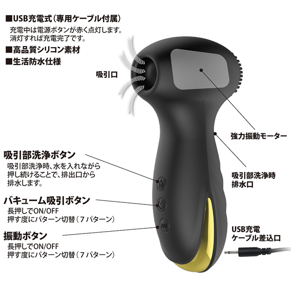7種の吸引力と7種の振動パターンでクリトリスを吸い上げパワフル振動!唇に包まれ吸われるような快感が貴女を絶頂へと導きます♪吸引口の後ろ側にはモーターを内臓、表面の細かな突起で乳首や好きな箇所をピンポイントに刺激して楽しむのも有り!また、使用後の衛生面が心配という方も安心な生活防水付きで、吸引口から水を入れて洗浄することも可能。 排水機能もしっかり備わっており、使った後はお手入れして清潔に保管していただけます♪USB充電式(専用コード付)、高品質なシリコン素材を使用しています。 ![]() --![]() ハンマーヘッド![]() パッケージ:22.6×15.7×6.2cm 本体:12.8×6.6cm・吸引部1.7cm USB充電式![]() [ BACK ]