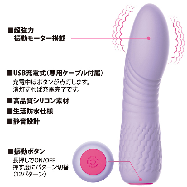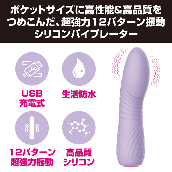 ![]() 全長11.8cmのコンパクトなボディに高性能と高品質を詰め込みました♪12種の強力振動でピンポイント刺激が楽しめる淡いパープルカラーの一本式シリコンバイブレーター。