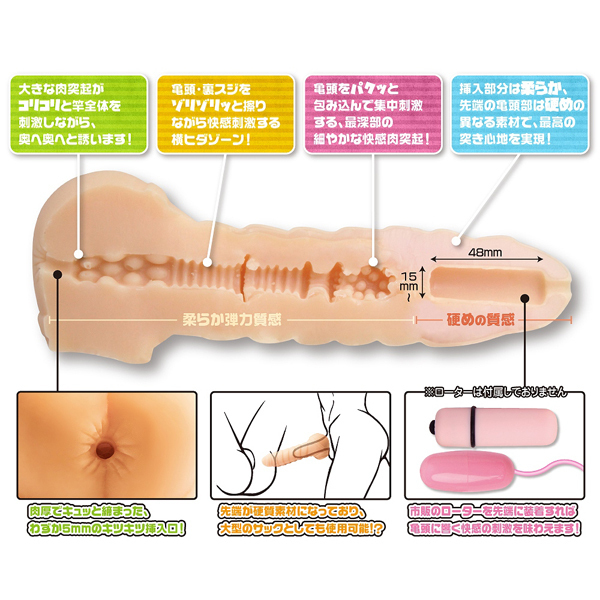 お尻の穴の先はサオをゴリっと刺激するイボゾーンや、亀頭と裏筋にゾリゾリ刺激を加える横ヒダ空間、亀頭を咥え込み集中刺激する肉突起ゾーンを配置し、緩やかな快感でフィニッシュまで導きます♪先端部にはローターを装着することも出来るため、市販のローターをプラスして亀頭へ快感振動を与えることも可能!1つで多様な楽しみ方をしていただけるホールとなっています♪ローション付属 ![]() --![]() --