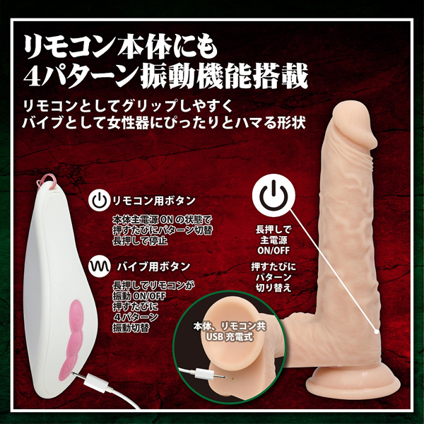 よりリアルな挿入感が味わえます。 リモコン本体も4パターンの振動機能を搭載。 女性器にぴったりとハマる第二のバイブとしても使用できます。 ●6パターン振動。 ●熱い怒張を感じさせる人肌ヒートモード搭載。 ●強力吸盤付き。 想像を絶する狂喜に舞い踊る超リアルな肉感ディルド!淫らに楽しめる快感をぜひお楽しみください。 ![]() --![]() 双の舞![]() パッケージ:21.0×11.0×7.6cm 本体:20.5×3.6cm USB充電式![]() [ BACK ]