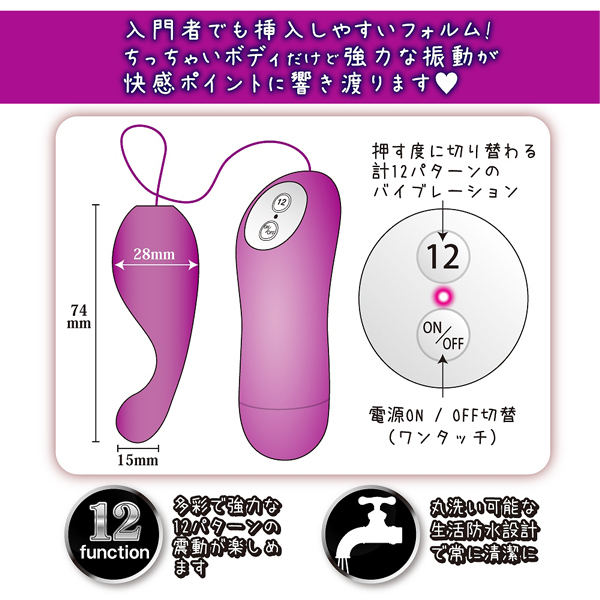 ポコッと飛び出た先端が絶妙な角度でGスポを狙い撃ち!コンパクトボディから繰り出される12パターンもの強力振動が最高の絶頂へと誘います。 初心者さんも簡単なシンプル操作!肌に優しい柔らかなシリコン素材を採用。 生活防水、電池式(単4電池×2) ![]() --![]() --