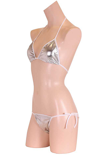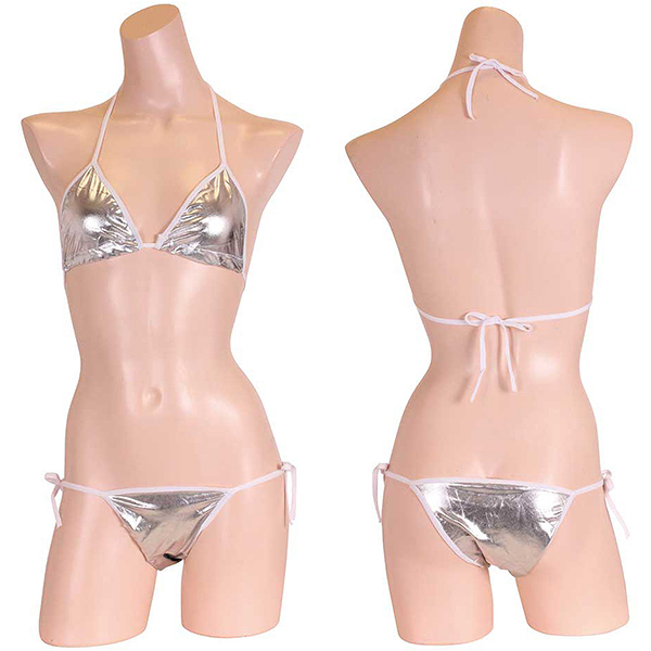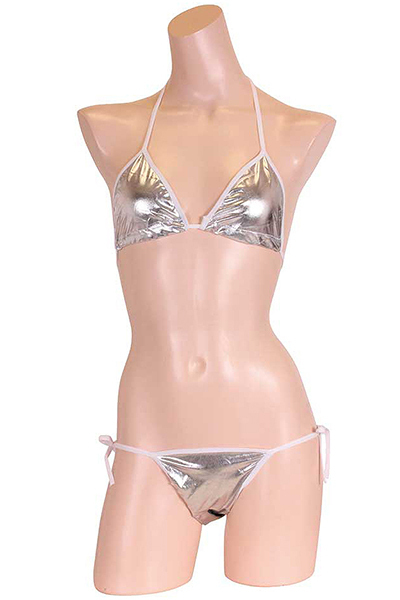 ![]() 夏の浜辺でクールにキメる!上品な輝きを放つメタリック生地のシルバービキニ。