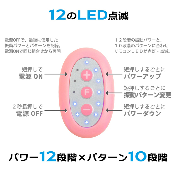 12段階のパワフル振動×10種類の振動パターンでおよそ120種もの快感による完全支配!リモコンにはパワーや振動が解りやすいLEDを12個を搭載、5分で自動的にOFFになる一時停止機能も完備しています。 完全防水&静音設計 ※リモコンには電池を内蔵 ![]() ピンク![]() --