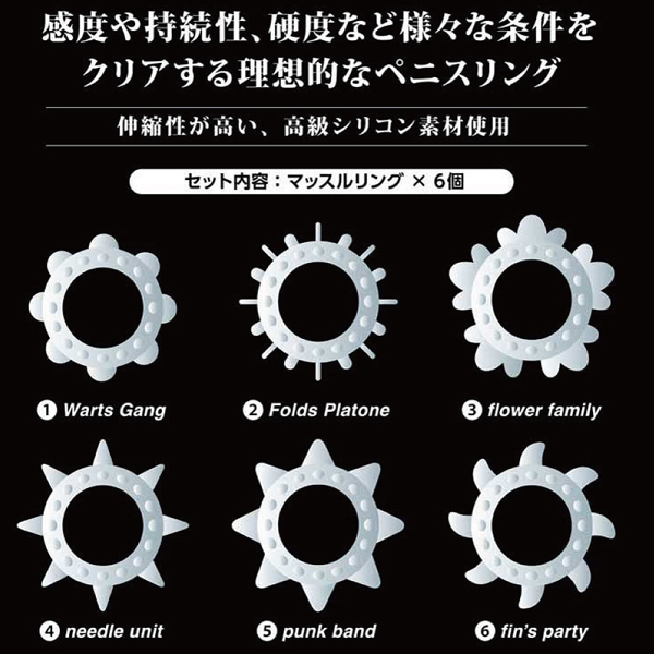 ![]() 6つの個性豊かな形状が楽しめる高級シリコン素材のペニスリング。