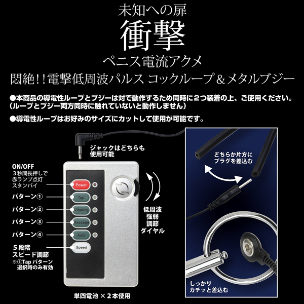 5段階のスピード&4種類のパターンから選べる電撃低周波刺激♪悶絶必至の電流刺激に未知なる扉が開かれる!他にも拡張に応じて使えるアタッチメントを多数販売中◎ループはお好きなサイズにカットして使用していただけます。 ![]() --![]() コックループ&メタルブジー![]() パッケージ:13.5×7.0×5.5cm 本体:フリーサイズ・ブジー10.5×3.5〜7.5cm セット内容:コントローラー、コックループ、メタルブジー、接続ケーブル 電池:単四電池×2本使用 ![]() [ BACK ]