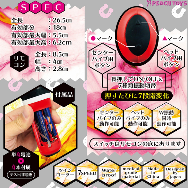 ヤバイほどの快感が全身を駆け巡る!素材はハリ弾力に優れたメディカルグレードTPR仕様。 7種類の振動を搭載し、お手入れしやすい生活防水式!振動は独立操作可能◎単4電池を4本使用 ![]() --![]() ウマナミブラック![]() パッケージ:35.0×7.5×8.2cm 本体:全長26.5cm・挿入部18.0×5.5cm 電池:単四電池×4本使用![]() [ BACK ]