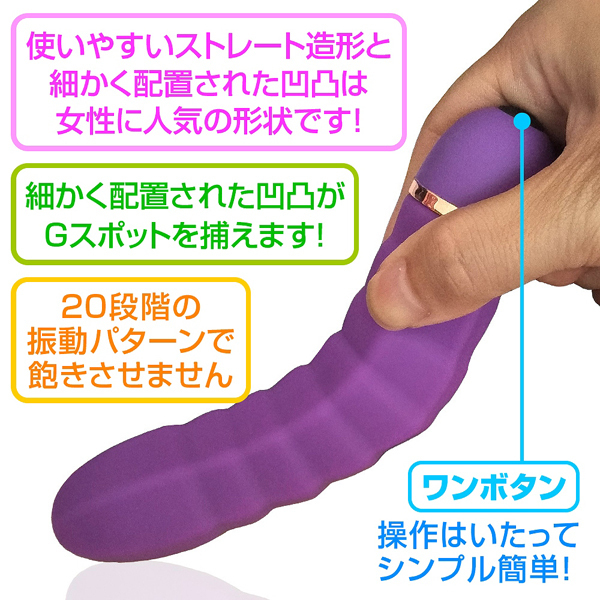 段々と配置された凹凸がGスポを捉えて振動刺激!素材は肌に優しく柔かい高品質シリコン製。 20種類の多彩なアクションがワンボタンで選べるシンプルで使い易い初心者向けバイブ◎単三電池を1本使用 ![]() --![]() MEZ11709![]() パッケージ:19.0×7.4×6.0cm 本体:16.0×3.2×3.2cm 電池:単三電池×1本使用![]() [ BACK ]