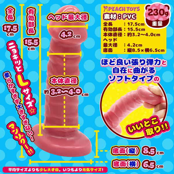 ●使用後に立てて置ける土台つき。 ●柔らかいのに弾力感たっぷり♪のソフト素材。 ●ほど良い張り弾力と自在に曲がるソフトタイプのいいとこ取り。 ●硬くない!コシが有るソフト素材がイイ感じ。 ●素材:PVC。 ●MADE IN JAPAN ![]() ソフトピンク![]() L![]() 本体:全長17.5cm・有効部分15.5cm・ヘッド最大径4.2cm・底面最大径8.5cm![]() [ BACK ]