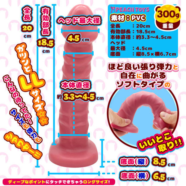 ●使用後に立てて置ける土台つき。 ●柔らかいのに弾力感たっぷりのソフト素材。 ●ほど良い張り弾力と自在に曲がるソフトタイプのいいとこ取り。 ●硬くない!コシが有るソフト素材がイイ感じ。 ●素材:PVC。 ●MADE IN JAPAN ![]() ソフトピンク![]() LL![]() 本体:全長20.0cm・有効部分18.5cm・ヘッド最大径4.5cm・底面最大径8.5cm![]() [ BACK ]