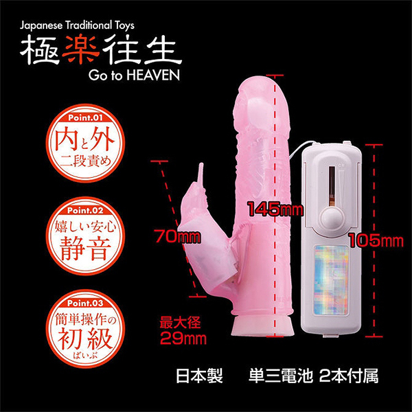 ![]() 手頃に使えるハンディサイズで気持ちいいところを内外から同時に責められるシンプルバイブ「極楽往生」。