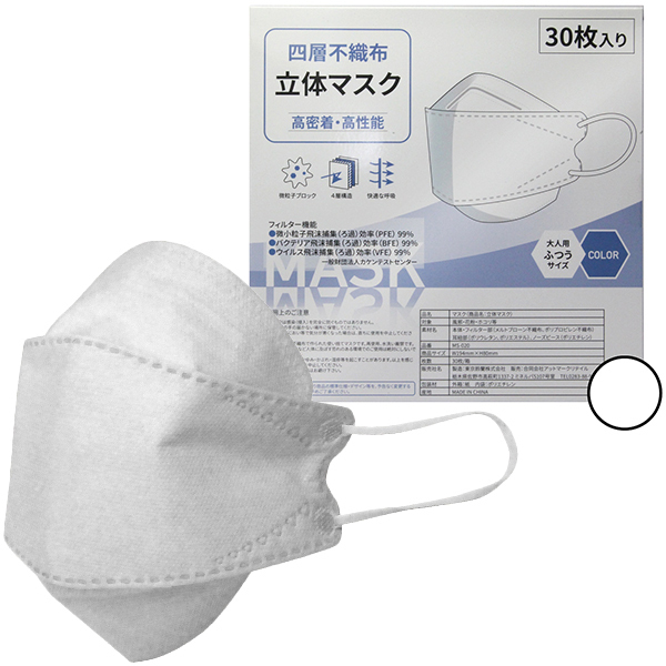 ![]() 風邪・花粉・ウイルス対策に♪四層不織布立体マスクの30枚入り(ホワイト)です!大人用の普通サイズで高性能四層不織布立体マスク!微小粒子飛沫捕集率(ろ過)効果(PFE)99%。