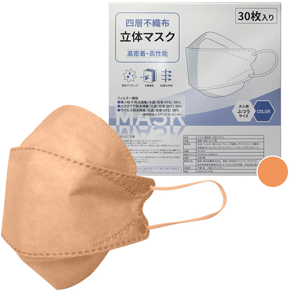 ![]() 風邪・花粉・ウイルス対策に♪四層不織布立体マスク(アプリコット)の30枚入りです!大人用の普通サイズで高性能四層不織布立体マスク!微小粒子飛沫捕集率(ろ過)効果(PFE)99%。